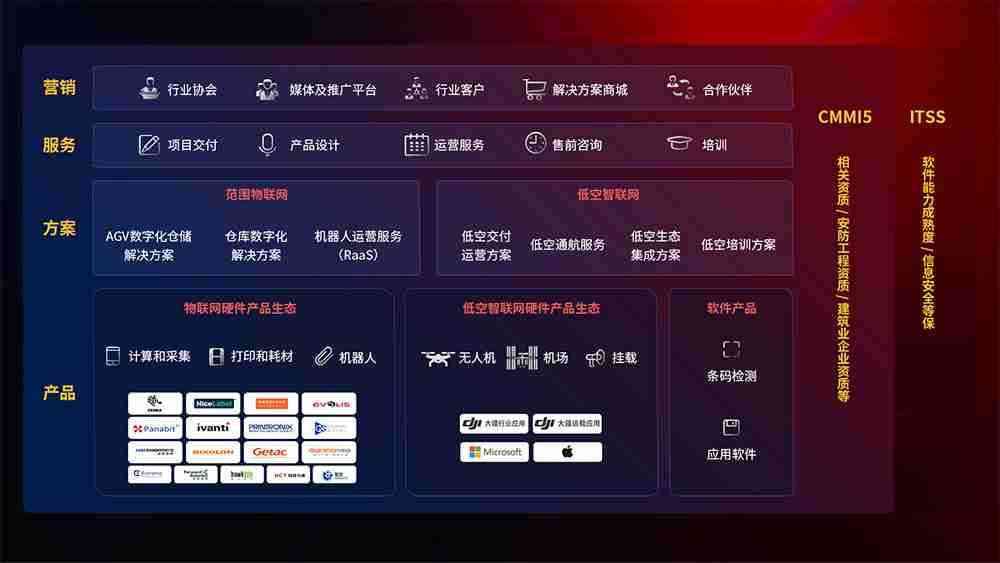 聚合国内外先进的物联网硬件产品品牌,,,聚焦数字化仓储、、、机器人运营、、、、低空智联网等领域,,共同打造适合客户业务场景的解决方案并提供交付服务